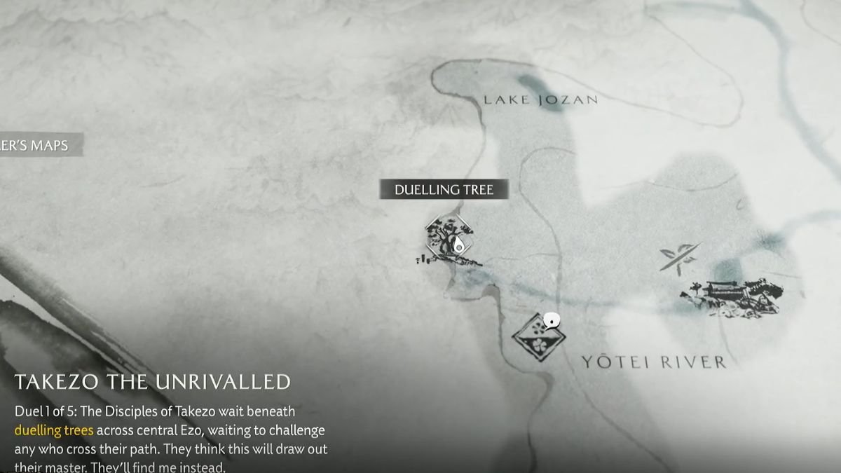 Duelling Trees are part of the quest chain called Mythic Tale: Takezo the Unrivalled. There are two ways to trigger this quest. The first trigger is to head over to any Duelling Tree by chance and fight the enemy within. After the battle, Ugetsu the Storyteller will appear to tell you a tale about the Disciples of Takezo. This also marks all potential Duelling Trees on the map.