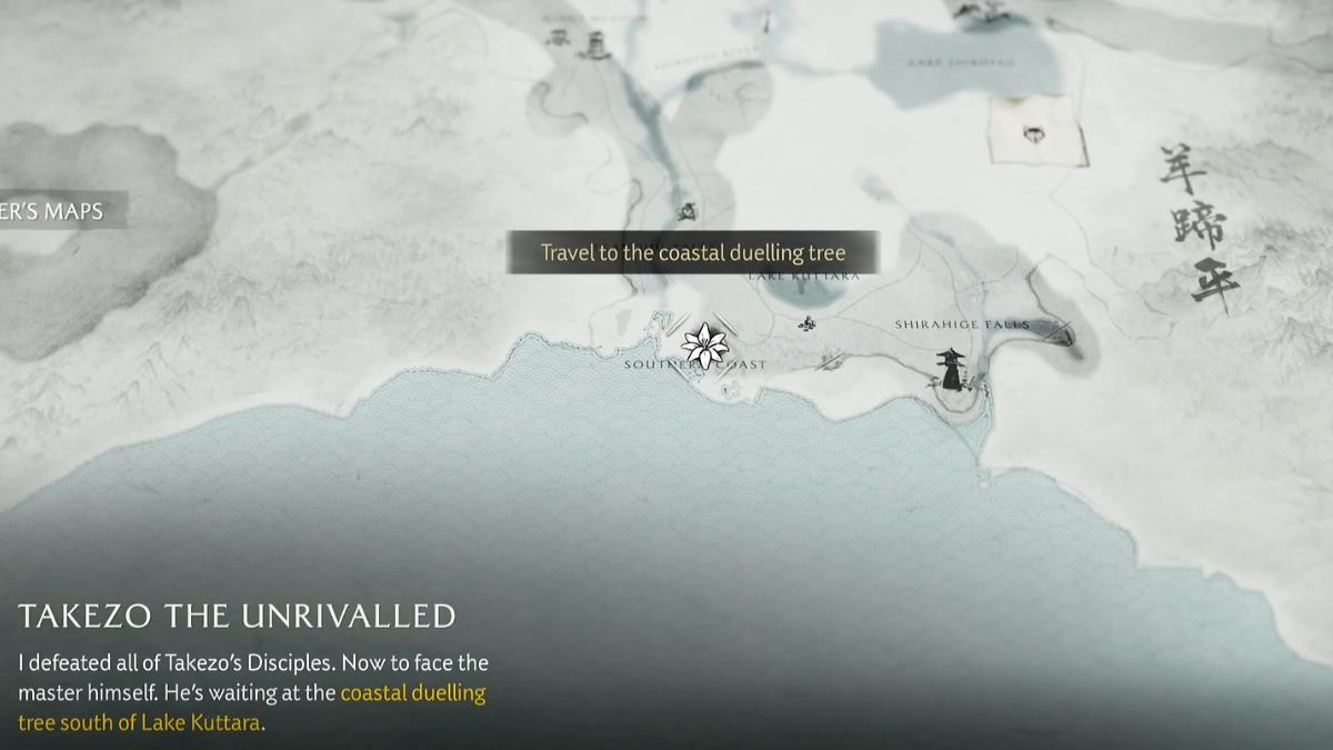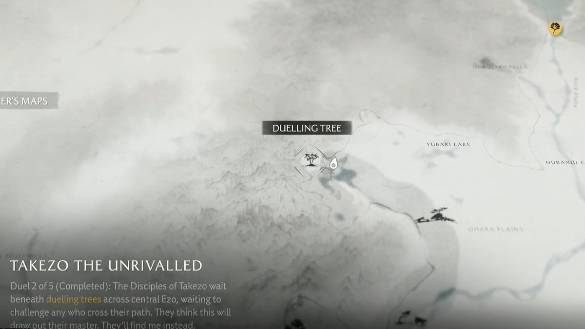 The second trigger is to make your way to Ugetsu the Storyteller inside a camp on the Southern Coast of the Yotei Grasslands. The camp is right beside the Coastal Duelling Tree, which is the final location for the Takezo the Unrivalled side quest. Let’s go ahead and take a look at where to find all the trees below.
