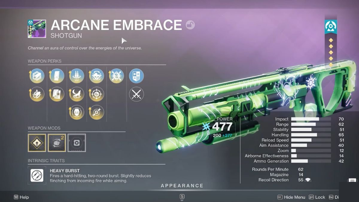 For the Arcane Embrace Energy Shotgun, you need to improve the damage output since weapon speed isn’t too viable here. The best perks for PvE include Fourth Time’s the Charm in Slot 1 and Aggregate Charge or Precision Instrument for Slot 2. Fourth Time’s the Charm returns two rounds to the magazine if you are lucky enough to rapidly land precision hits. Go for Aggregate Charge to increase damage output for each elemental debuff applied to targets, or pick Precision Instrument to increase precision damage when you sustain hits.