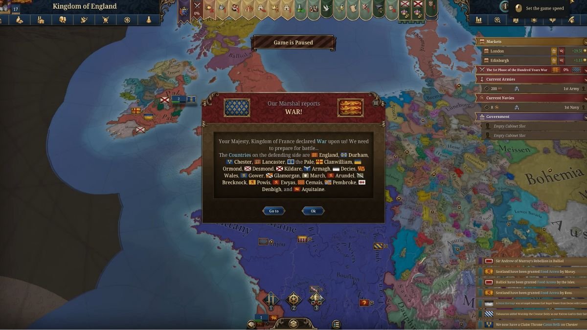 If your main goal isn’t to build an economy, but rather to get into politics and the military, then England would be a good choice to experiment on. England will be set up against France for the 100 Years’ War, giving you ample content to work on your military. England’s strength lies in its Navy, so focus more on maritime activities and improving your naval capabilities to overtake France.