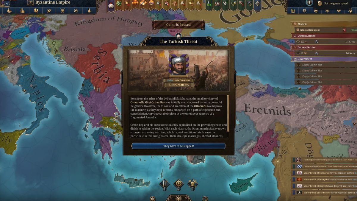 While picking which nation to expand to, avoid picking your immediate neighbors like the Karasids. Rather, try to improve your relations and ultimately overtake Constantinople first. Improving control over your existing states helps unify the Ottoman Empire more efficiently, rather than working on overtaking other nations and starting wars for expansion.