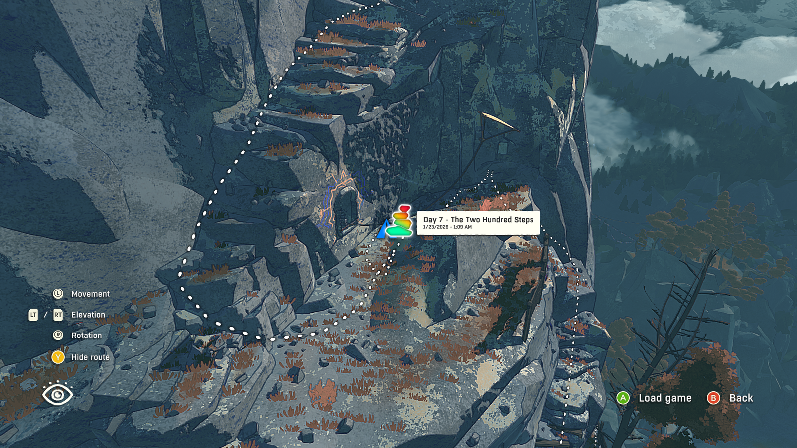 Grab the save point here, then make your way up this makeshift staircase that’s conveniently laid out on the mountainside.