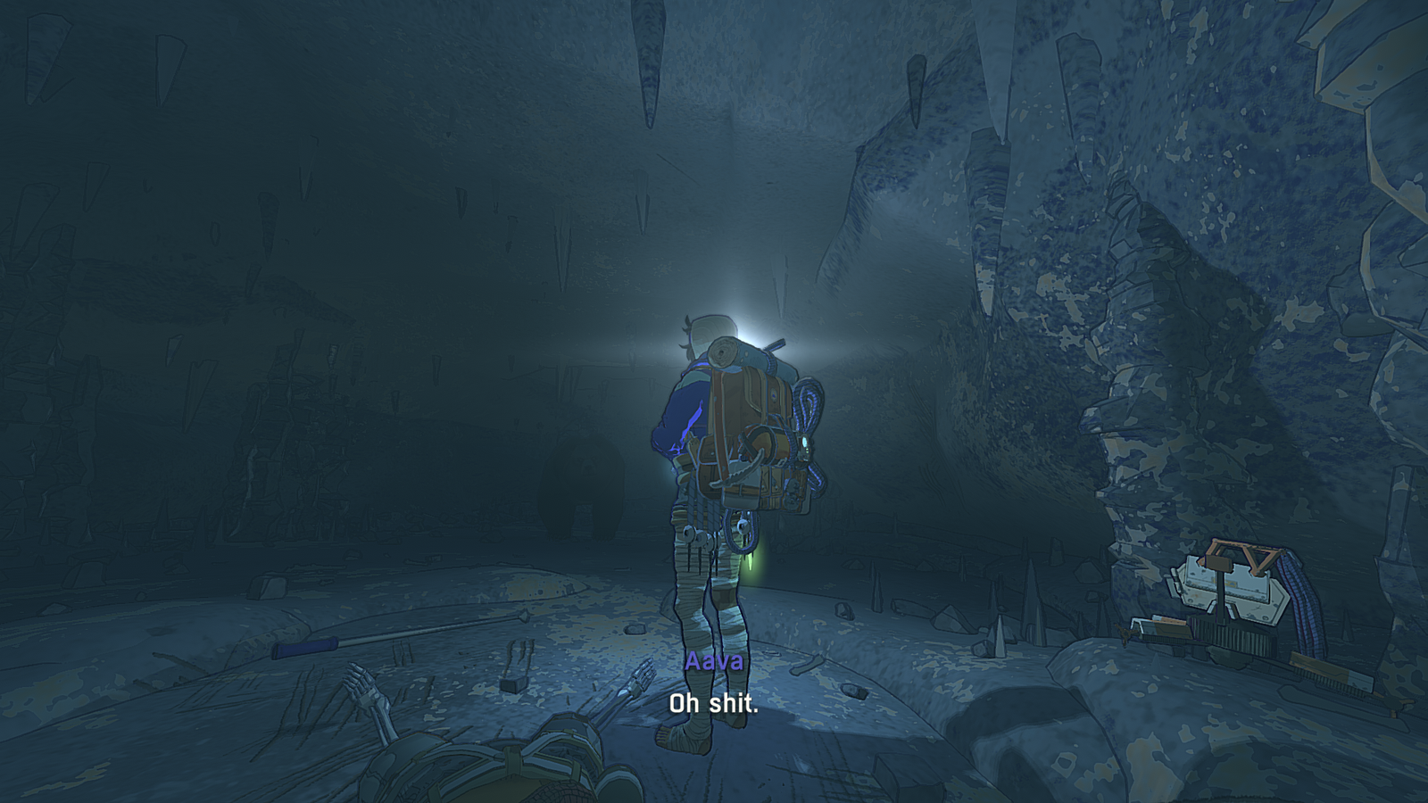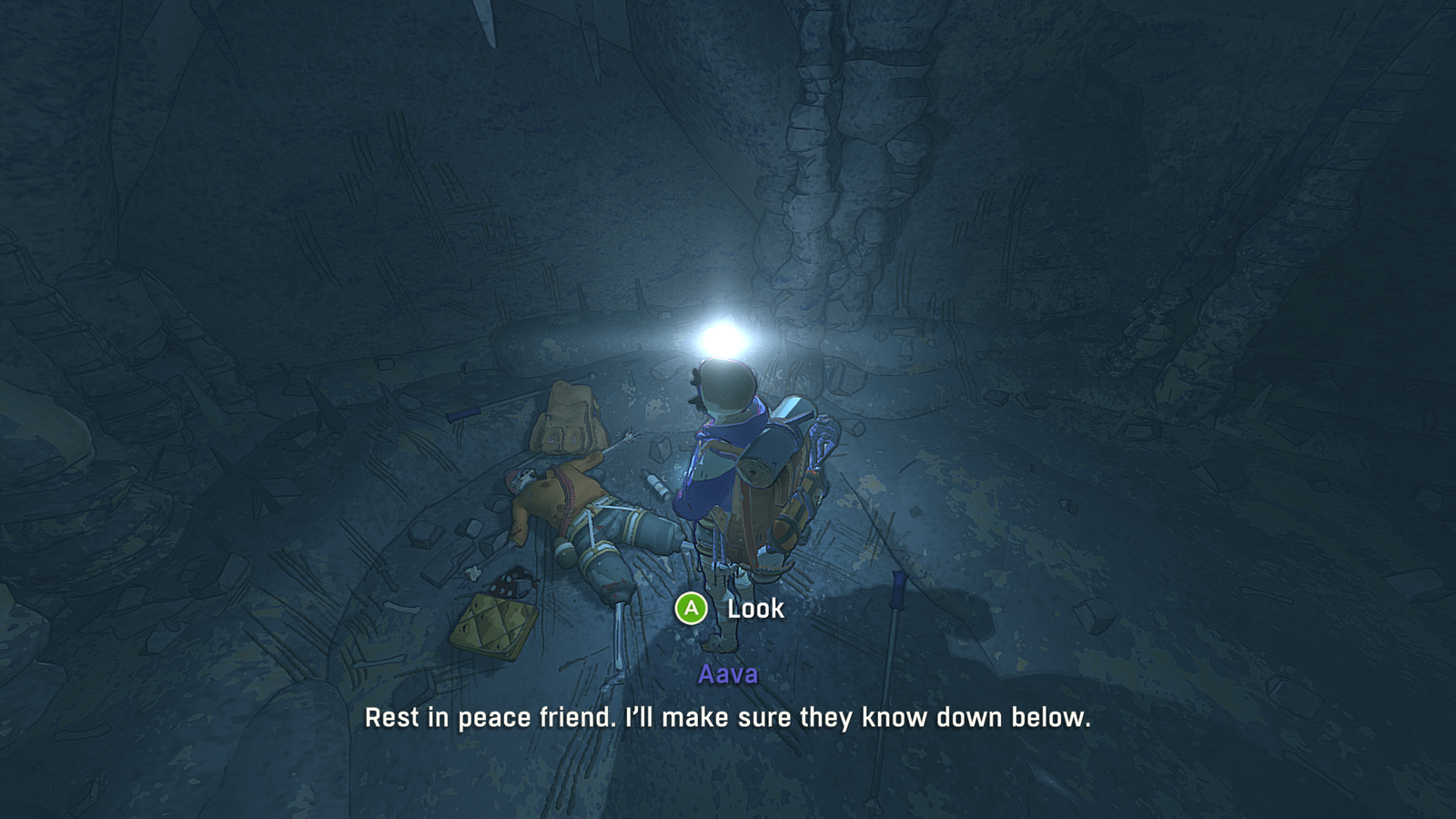 And wouldn’t you know it! This fellow climber was so kind as to die in this cave and leave you some helpful things behind. How thoughtful! Of course, perhaps there’s a reason he perished in this cave. Hmm… Eh, no bother.
