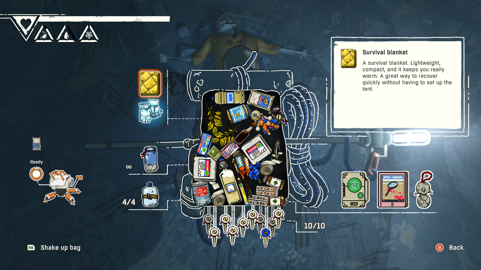 The most useful thing he has waiting for you is the Survival Blanket, which is incredibly handy. Even when you’re away from your tent and unable to rest, the Survival Blanket will allow you to take a moment to warm up, crucial to your survival on Mount Kami.