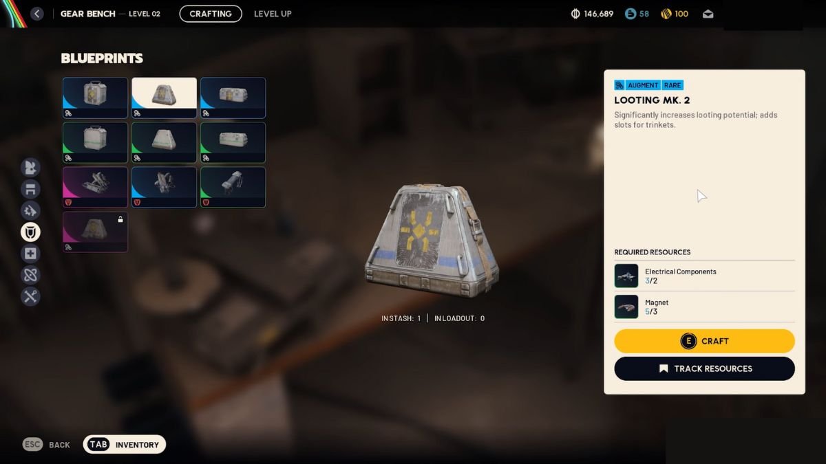 If you choose the crafting method, you must upgrade your Gear Bench to levels 2 and 3. Then, check the crafting section to find the two Augment blueprints required. The following are all the components required to craft Looting Mk. 2 and Looting Mk. 3.