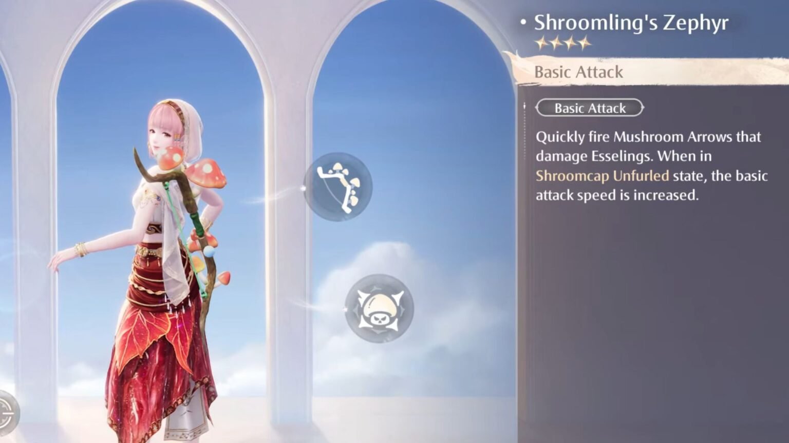 This bow allows Nikki to move and shoot while pressing the Attack button. If you use the Shroom Bloom archery skill, this will awaken the Shroomling’s Zephyr to trigger the Shroomcap Unfurled state.