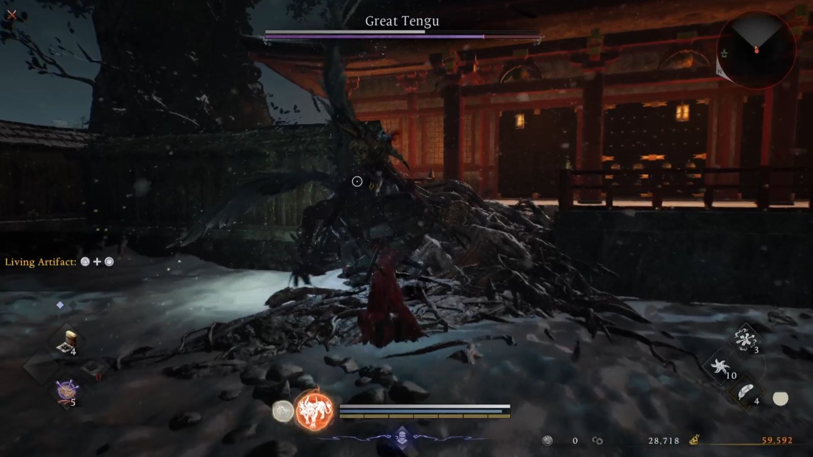Progressing through Mt. Kurama, you will eventually reach a gate leading to a building, near the Mt. Kurama – Temple Lodgings Shrine. Upon entering this gate, a short cutscene will play out and the boss fight against Great Tengu will begin.