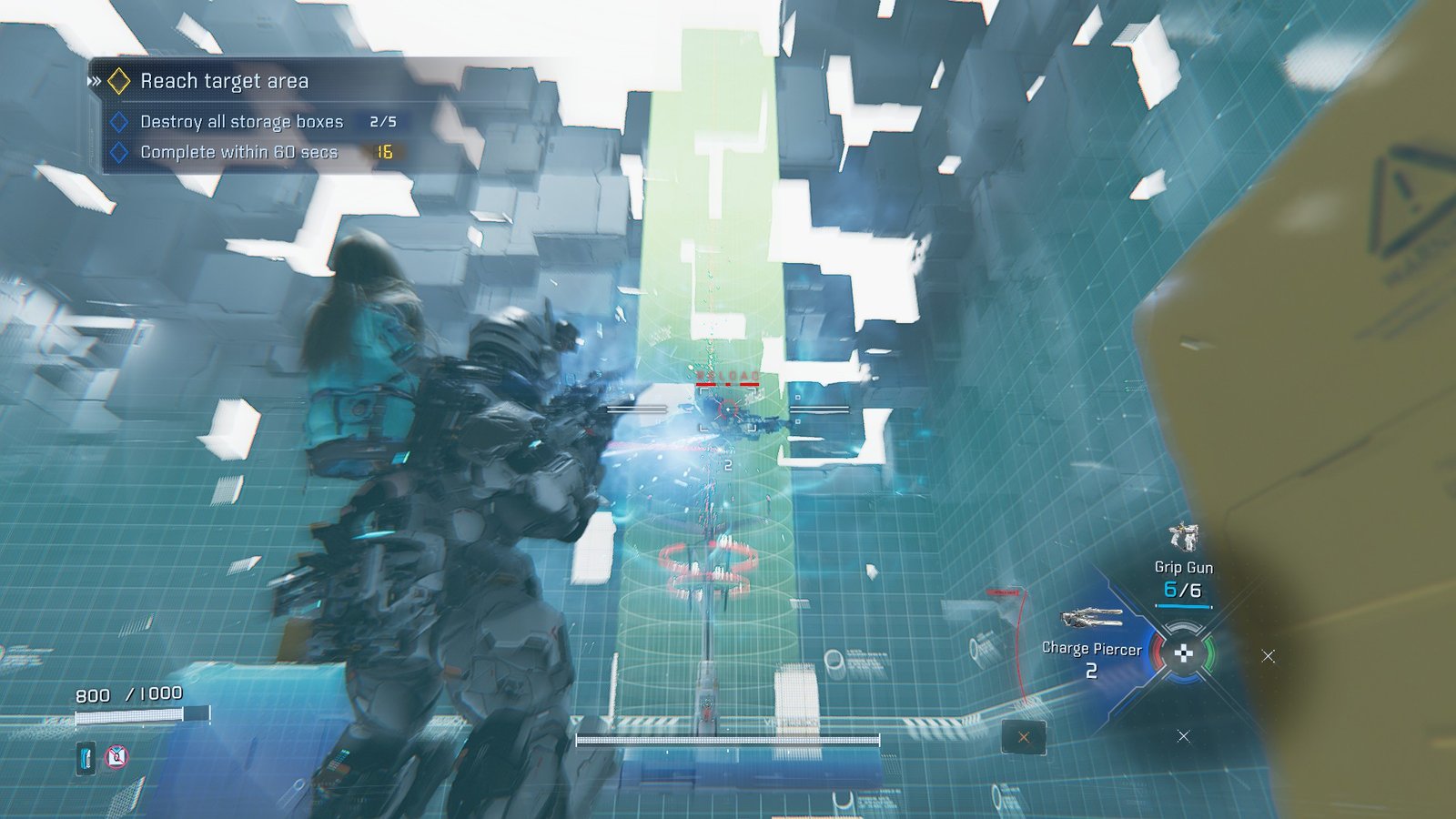 After the first bot is dead, grab the Charge Piercer at the end of the walkway and use it to railgun the two drones floating in the center of the stage. Rush past them and pop the last two as you make it to the target area. Don’t forget to pop the far back box for the full clear.