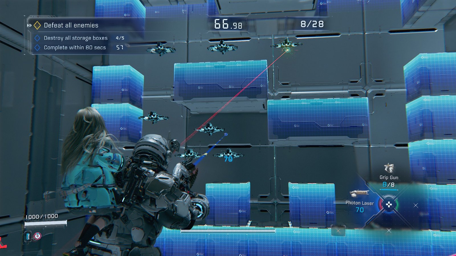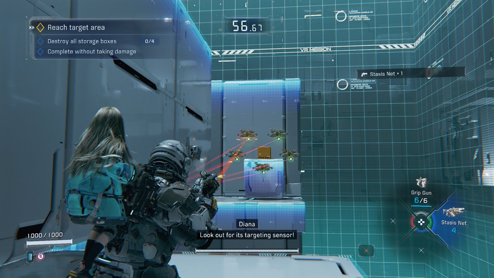 The pocket of 5 at the start will only take one, while the higher-tiered ones up the stairs will each need two, as they recover faster. Plink the boxes with the Grip Gun as you climb, and keep the drones trapped as you approach the final target area.