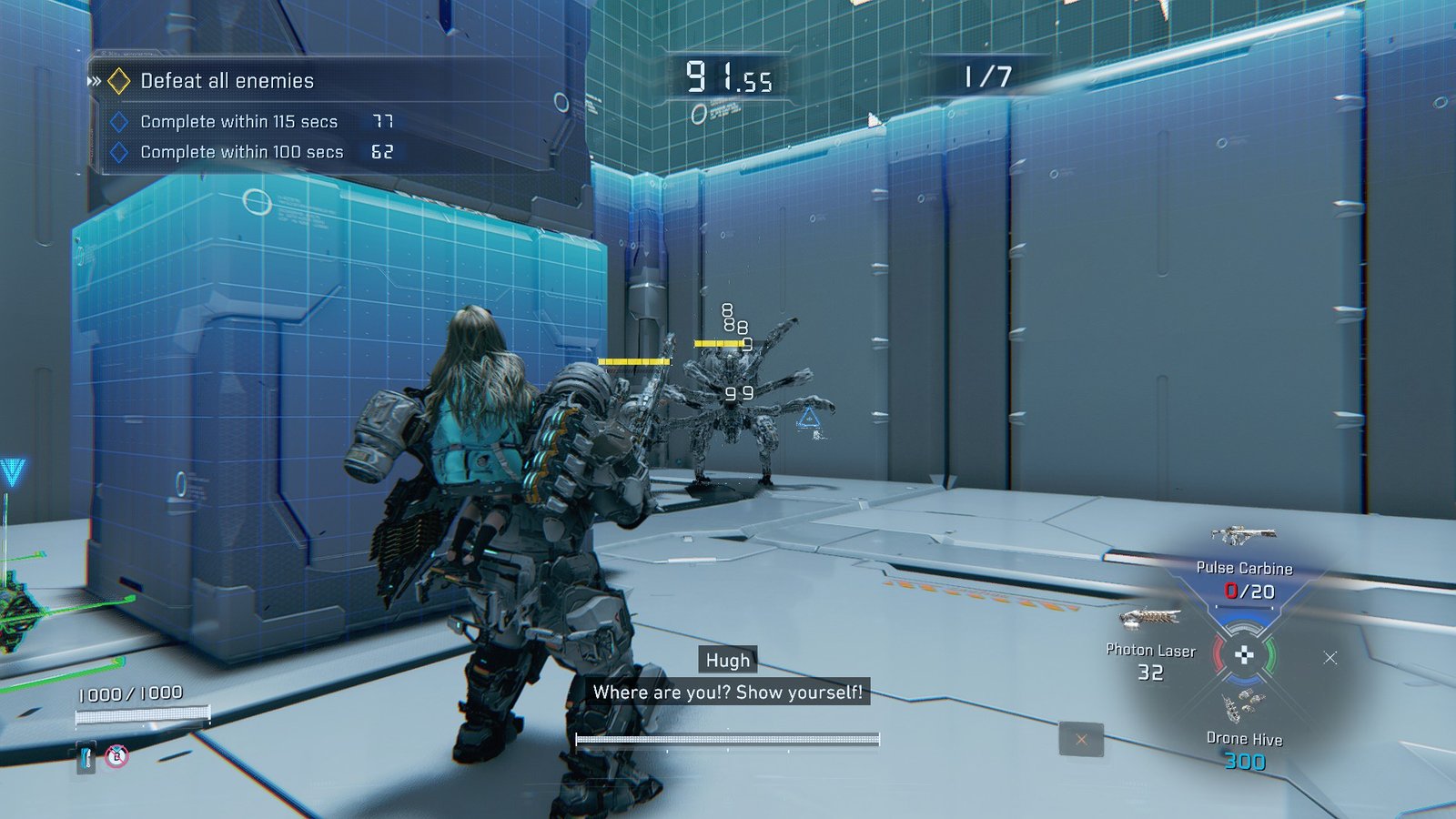 In this Training Simulation, you’re the one being hunted, as a Creeper is released as early as enemy two. Luckily, you’re given the perfect setup to keep an eye on it. Between the Pulse Carbine, Photon Laser, and Drone Hive, you can fire wide to force it out of it’s invisibility.