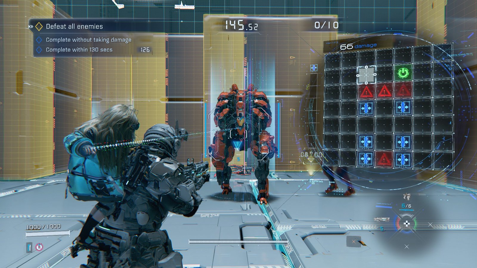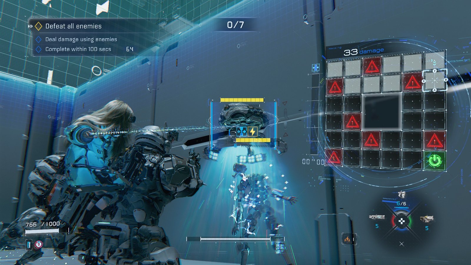 With very little room to work with, you’re up against two turret bots. Now is the time to pop that Impact Shield, giving you a bubble of safety to hack and fire from. They don’t have too much HP, so take them down, and you’re one off!