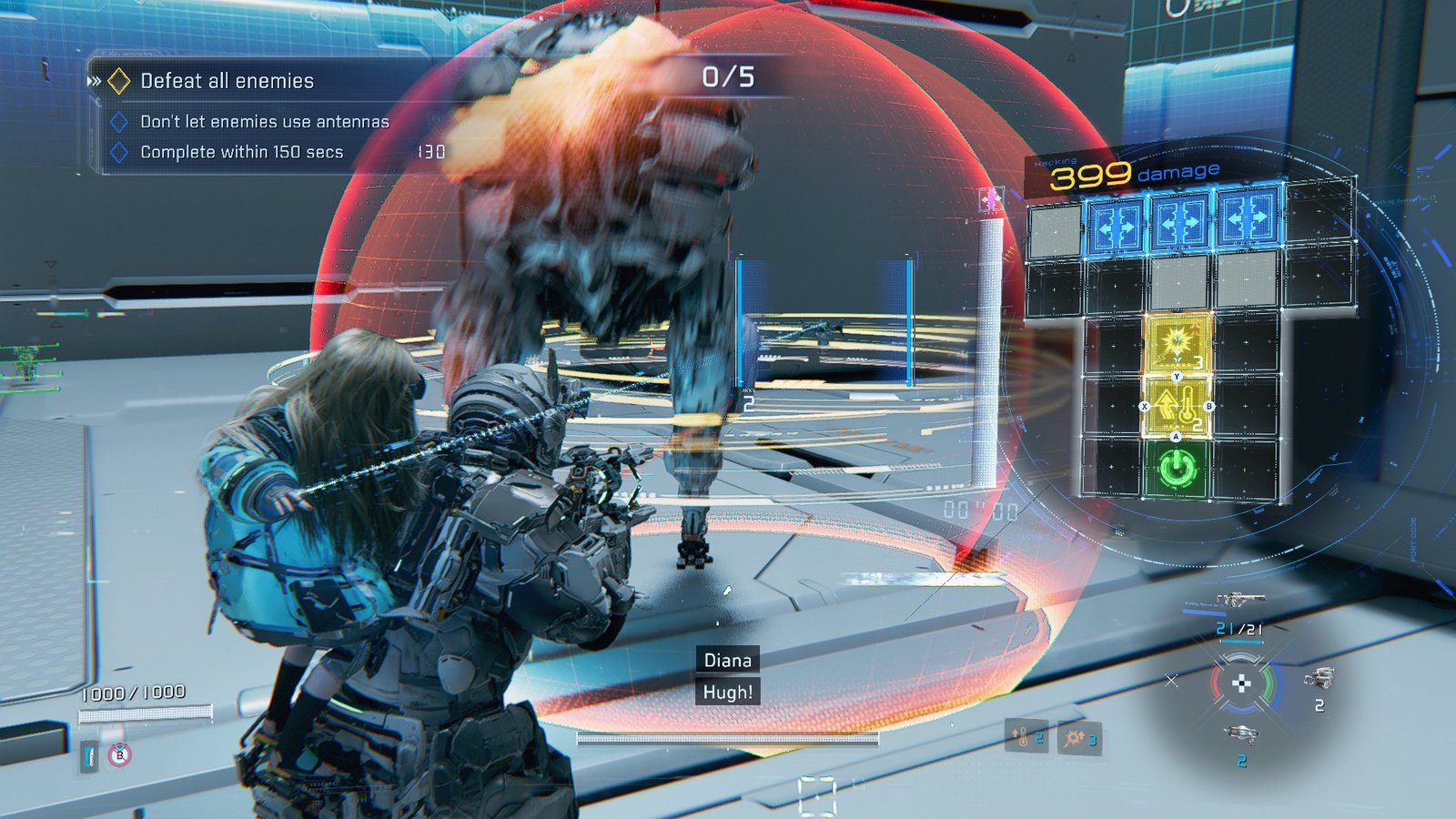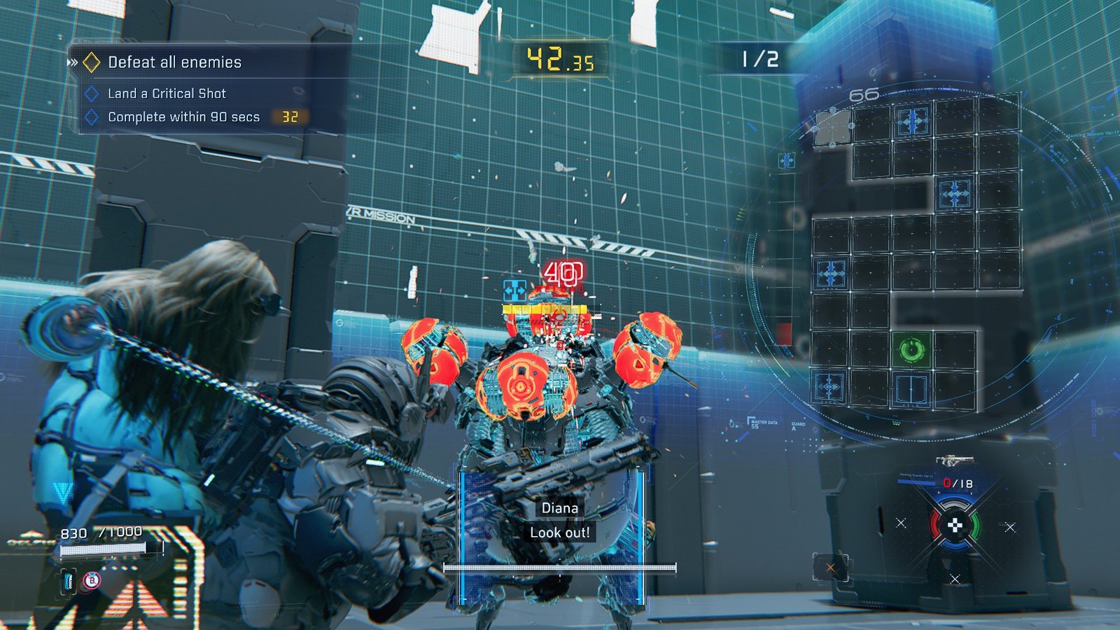 In order to complete the bonus objective and speed up the process of clearing the fight, try hacking a medic drone mid-heal. Opening the back menu will reveal a unique pattern for Diana, and clearing it will cause the Medic drone and the bot being healed to take a huge chunk of damage.