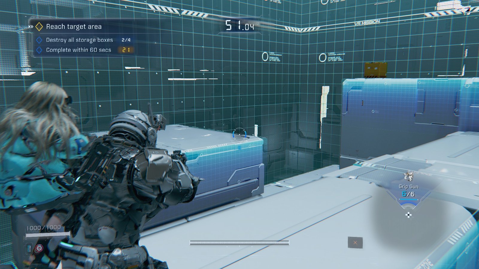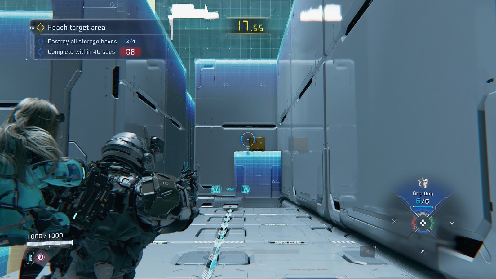 As you progress, pop the storage boxes with your Grip Gun to fulfill the first bonus objective. One is stuck on a quickly moving platform below the target area, and another is behind spawn, but you’ll need to ascend to find an angle on it.