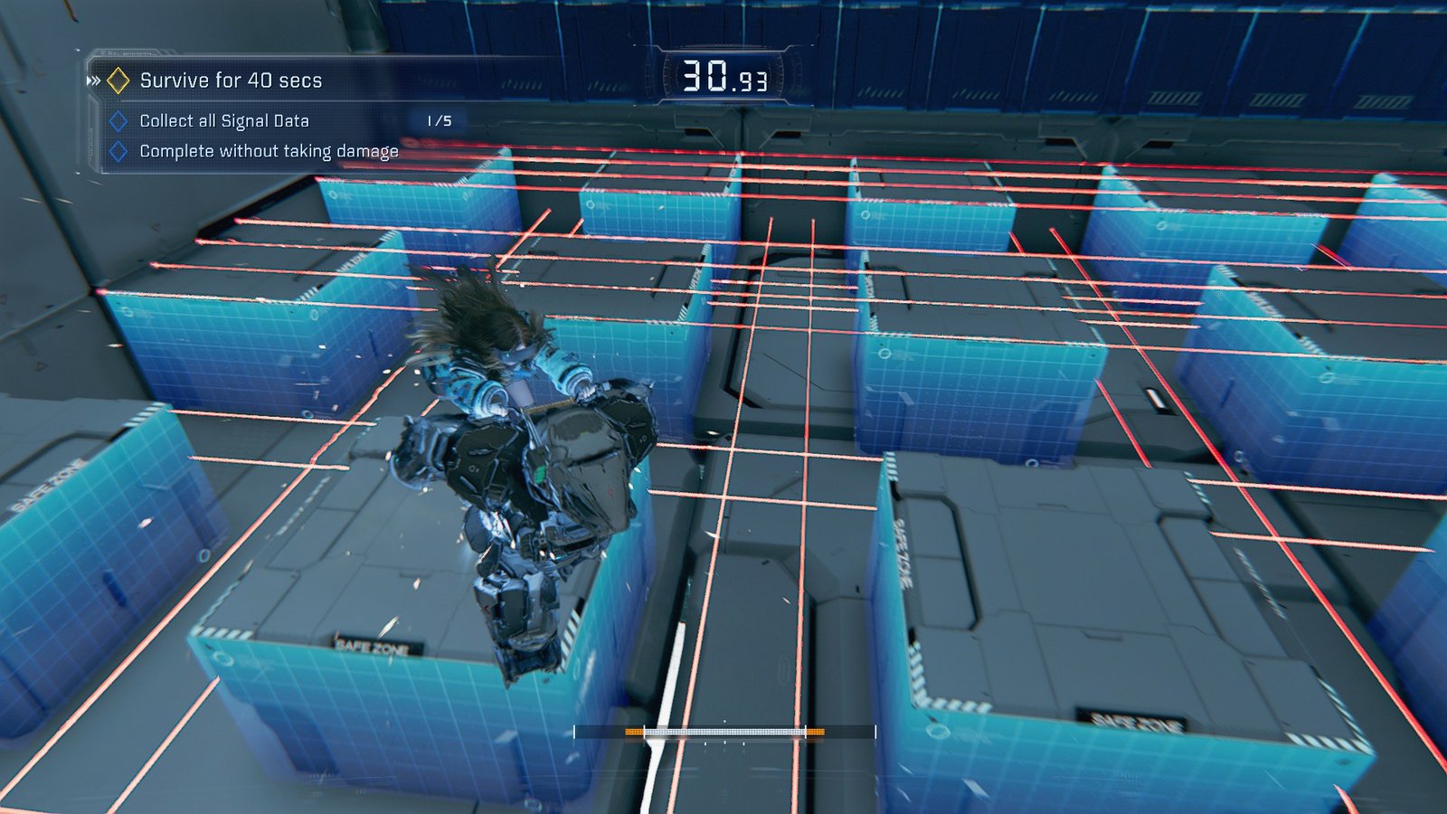 Another entry in laser grid dodgeball, Expert Red Flash places you above a laser grid that repeatedly rises and lowers. To beat it out, you’ll need to see the lasers coming, AND be able to snag all the Signal Data in the area.