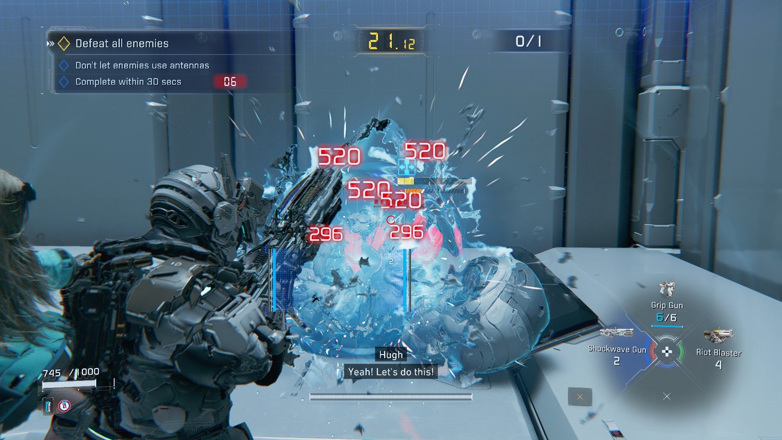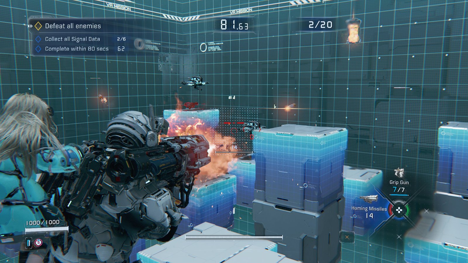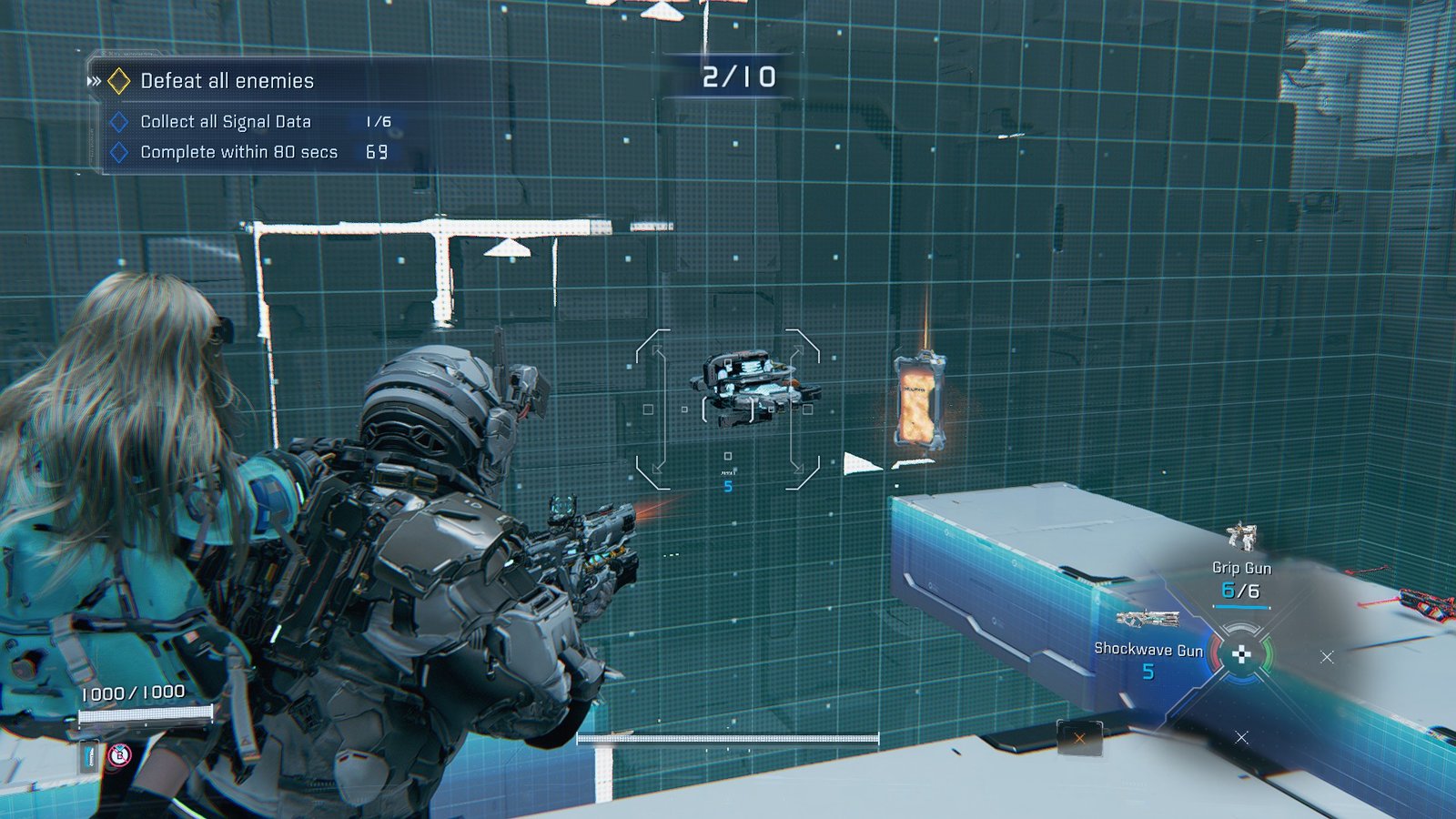 For a full clear, you’ve got to grab the 6 Signal Data packages around the map and clear all enemies in 80 seconds. The drones appear in bunches across the map, right beside the Shockwave Gun pickups.
