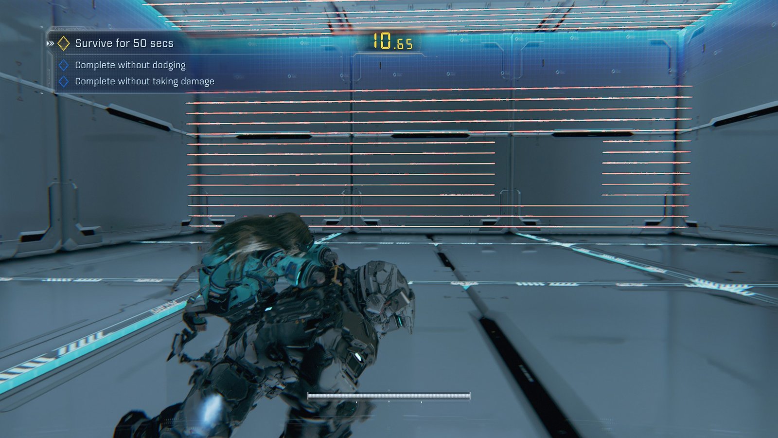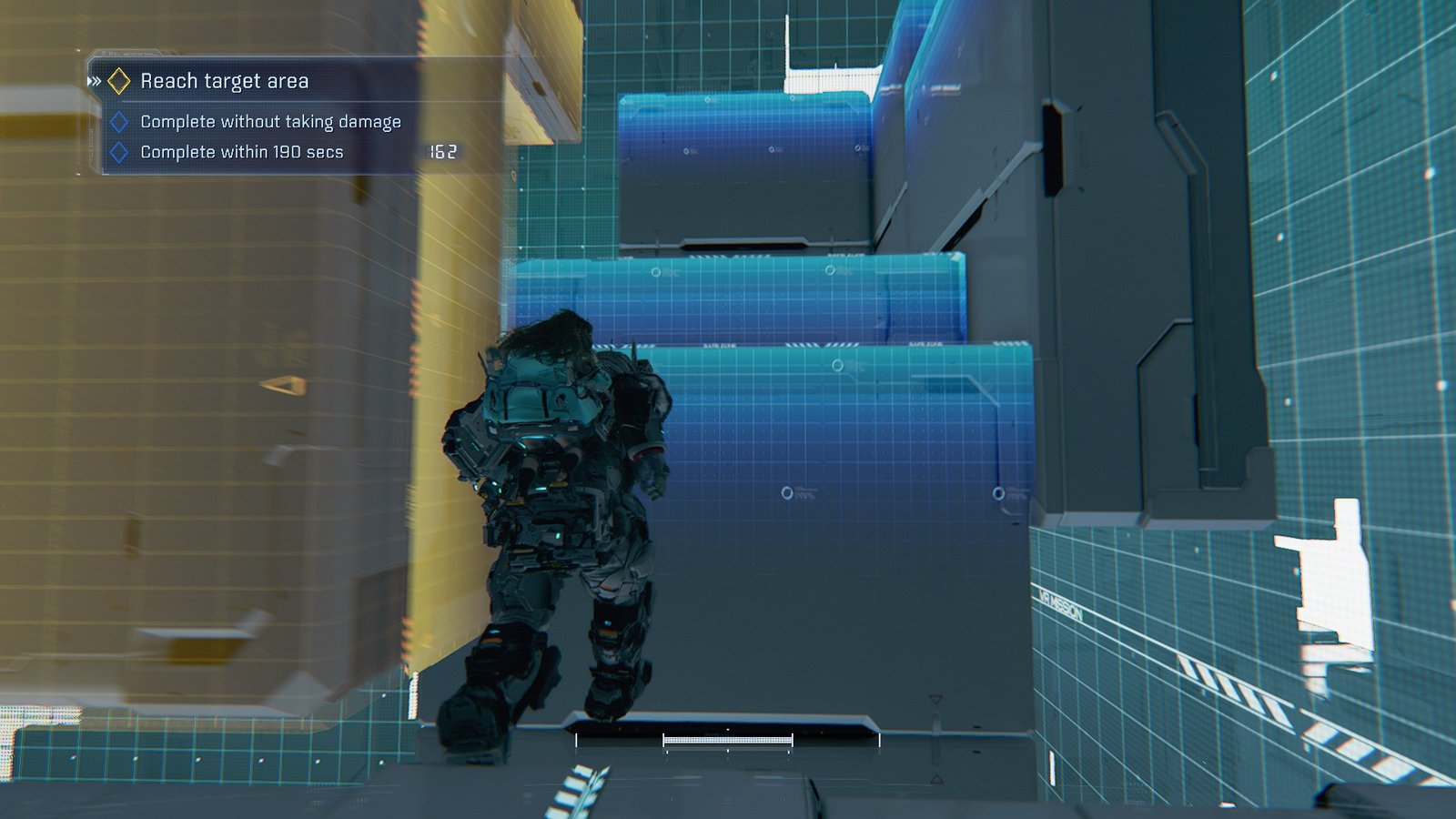 For a full clear, every bonus objective needs to be cleared in the same run. Luckily, Pragmata starts us off easy. Once the trial starts, hop on the floating platform to your right and ride it forward.