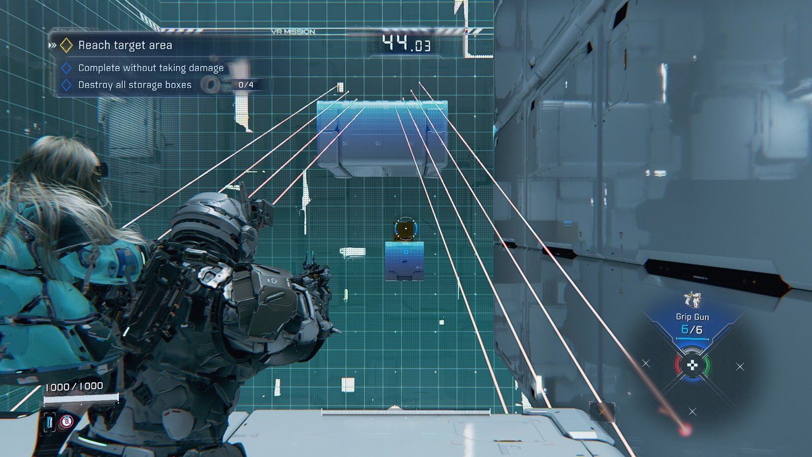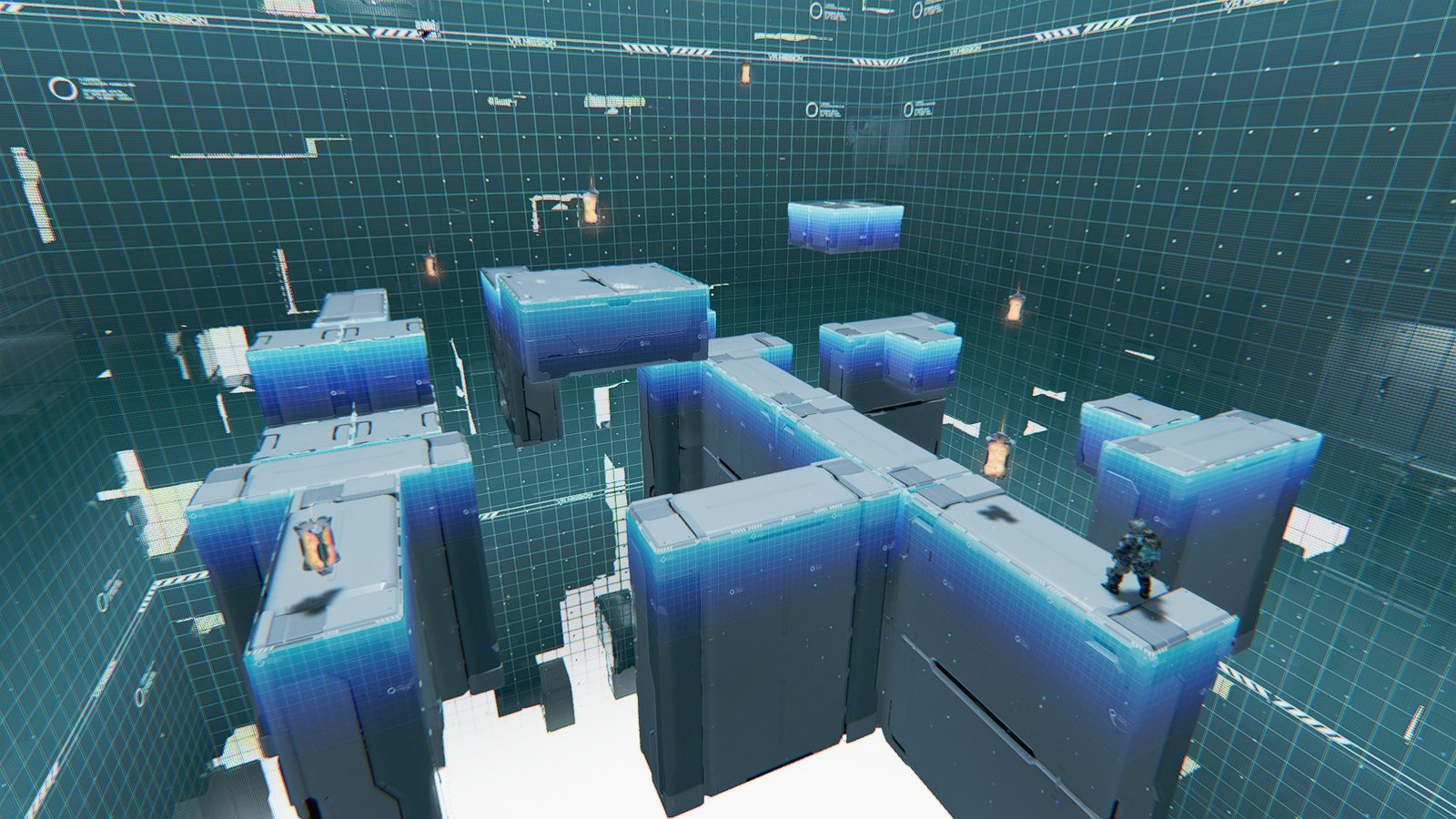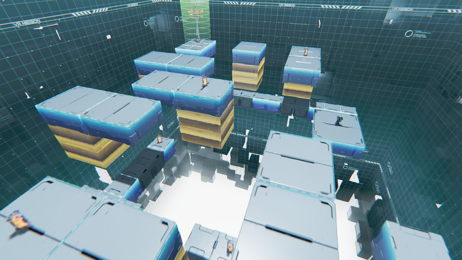 Along the Boxes is a hybrid movement and combat trial, requiring you to kill flying bots before the next platforms appear. You spawn with the Grip Gun and a Shockwave Gun, so blow away the first drone to summon the first set of platforms.