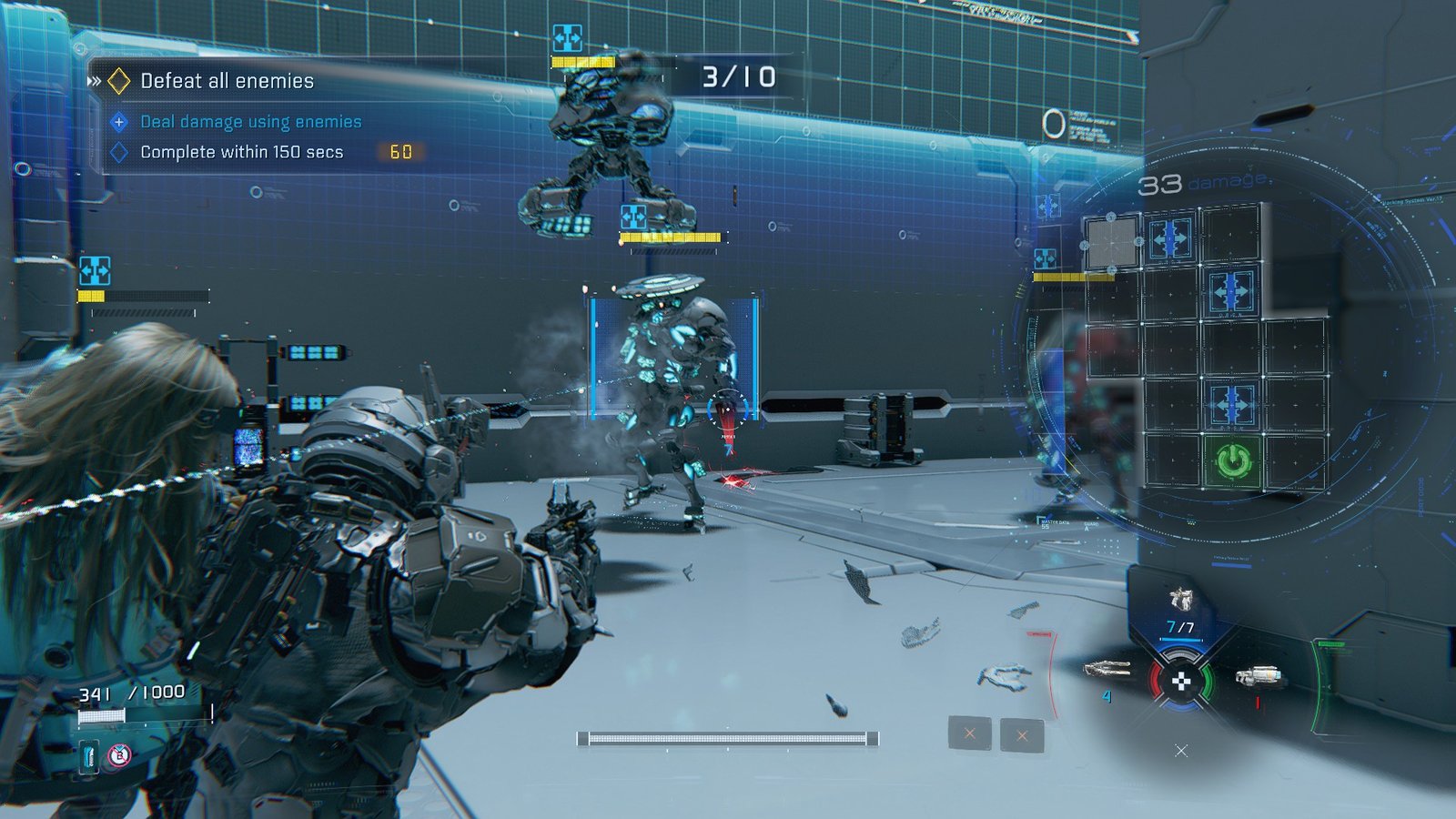 Those Medic drones are where we complete the bonus objective to deal damage using an enemy, just like the Medic challenge from earlier. The bots you face are increasingly threatening, from Lancers to eventually an Executor.