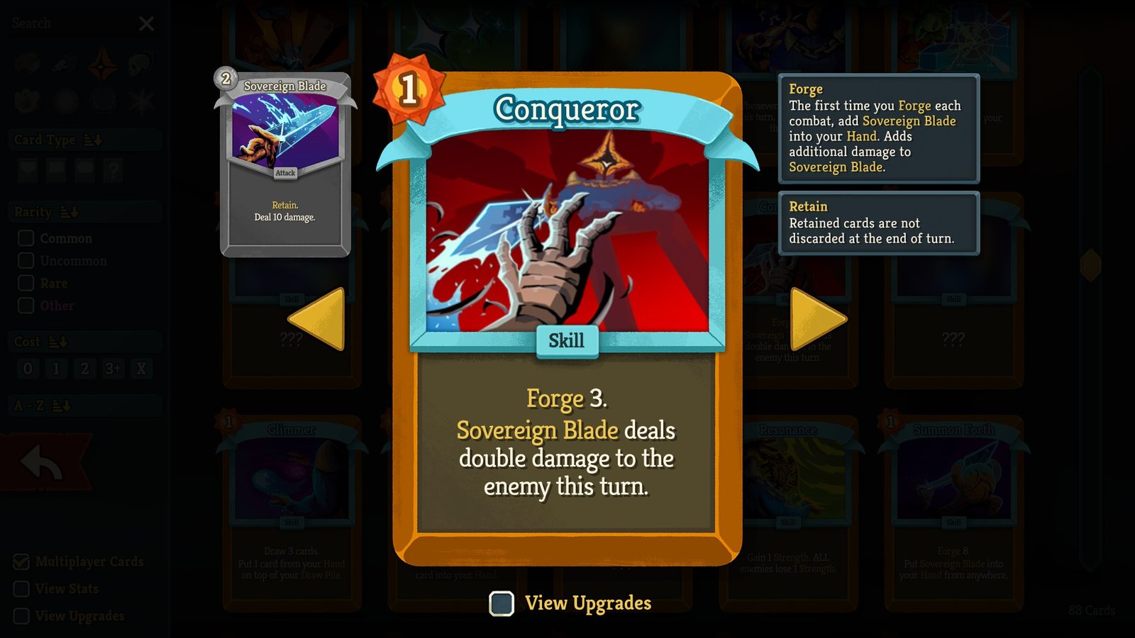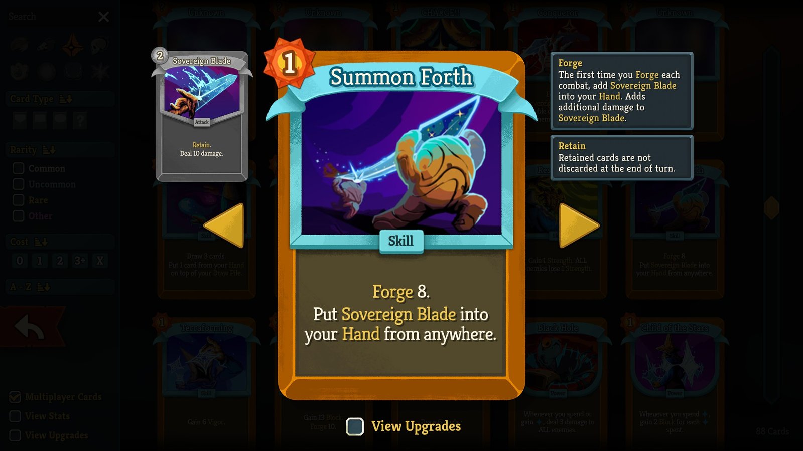 All the best archetypes need a silly card to obsess over as well, and Forge brings The Smith. The Smith is a 1 Energy, 4 Star cost card that Forges a whopping 30, adding Bludgeon-level damage to your Sovereign Blade.