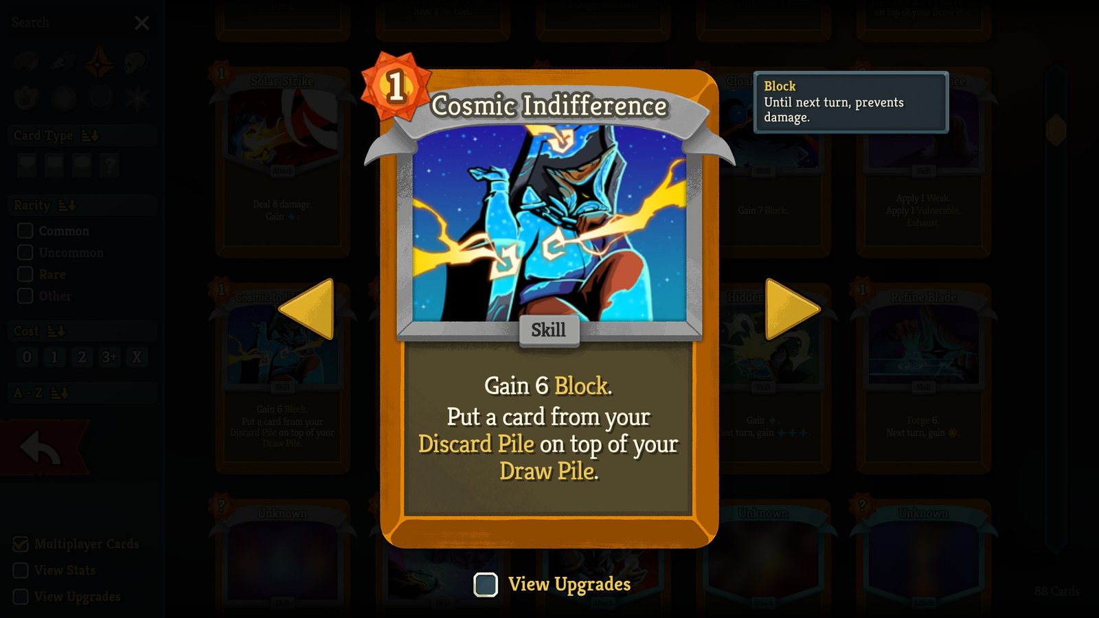 Yet another ‘Block with upside’ style card, Cosmic Indifference lets you ready a card you’ve recently played for reuse. Want to keep your Star loop going? How about your Sovereign Blade that you just swung?