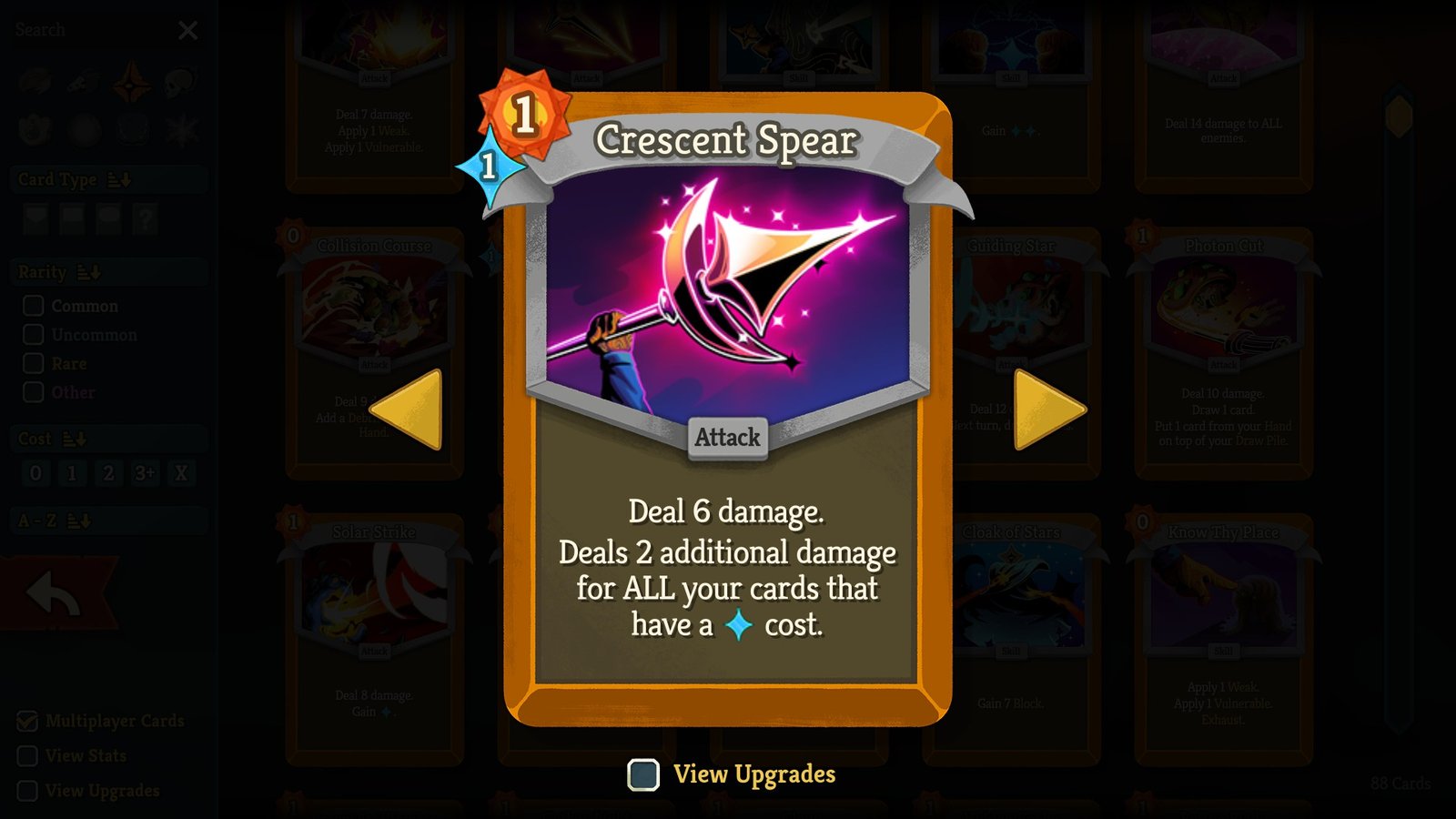 Unlike Perfected Strike, which requires you to keep around Strikes that are better replaced with stronger attacks, Crescent Spear only asks you to have cards with Star costs.