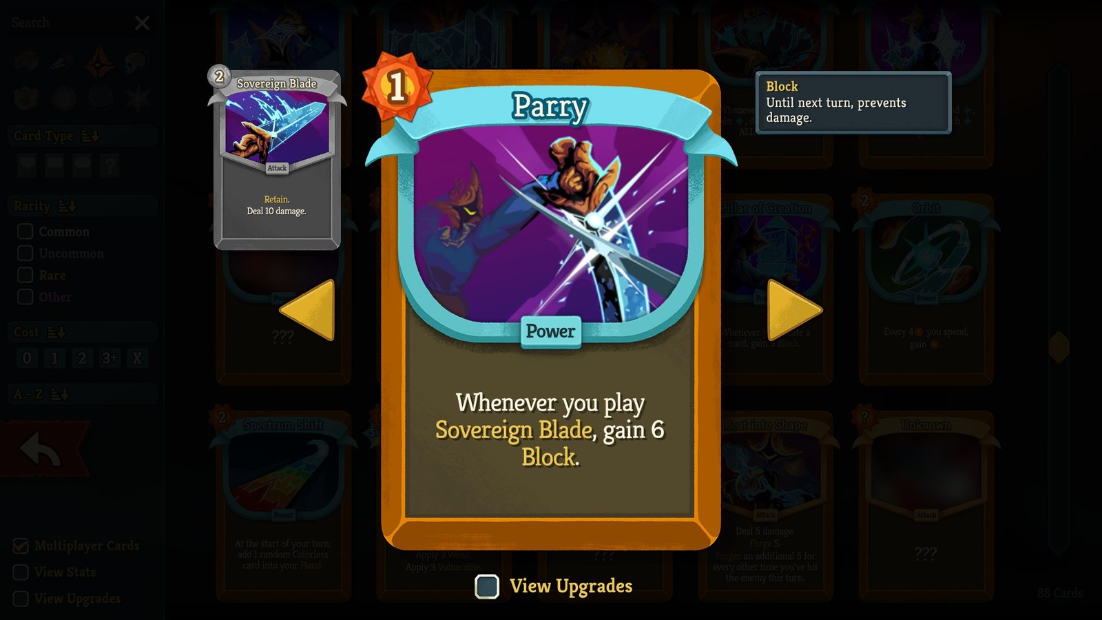 Sovereign Blade’s two-Energy cost makes it difficult to swing without leaving yourself open for counterattack. Luckily, the Regent has Parry, a single Energy Power granting a bit of block every time you play Sovereign Blade.