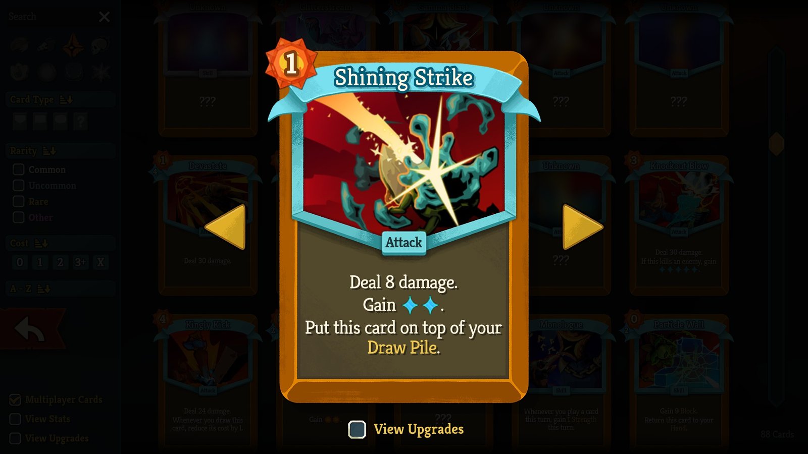 Shining Strike is a stellar option for this: it deals damage, generates 2 Stars, and loops itself back onto the top of your Draw Pile. With enough Stars, you can even let loose devastating attacks like Comet, dealing massive burst for only Star cost.