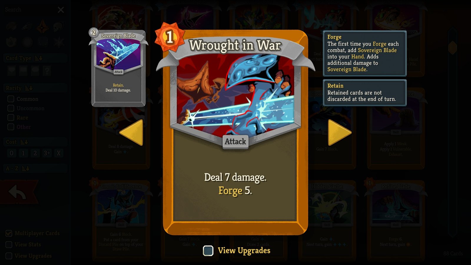 Wrought in War is another common card that acts as a straight upgrade to your basic attacks, dealing a point of extra damage and Forging 5. This lets Wrought in War act as a basic way to get the Forge train rolling, generating Sovereign Blade without slowing you down.