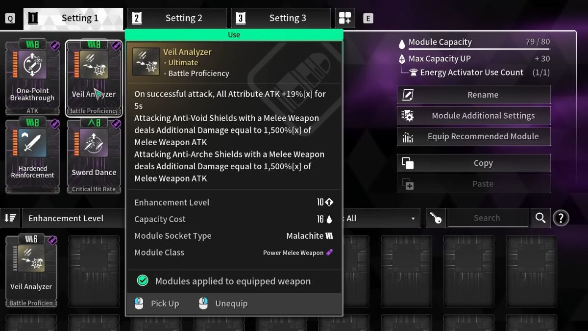 Sword Dance, while it does increase Critical Hit Rate, does not decrease the attack speed. Hence, this module is superior to other modules that might decrease the attack speed. Veil Analyzer and Hardened Reinforcement help improve damage output, while Toxic Enhancement improves Poison elemental damage. Penetration Enhancement offers better piercing damage output, but you could switch it out with Better Insight if you prefer to work on your Critical Hit Rate.